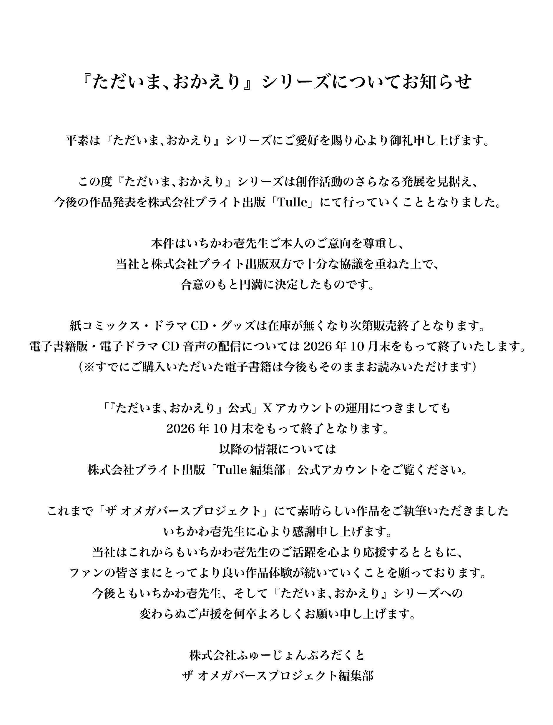 『ただいま、おかえり』シリーズについてお知らせ
